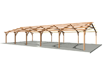 4- Les fermes Ariane® : fermes en treillis assemblées dans les noeuds sur des inserts en contreplaqué bouleau et des connecteurs de type vis ou clou. Ces fermes peuvent être à facettes, asymétriques, monopentes ou bipentes et principalement réalisées sur poteaux bois encastrés en tête formant des portiques de deux articulations (éventuellement trois).