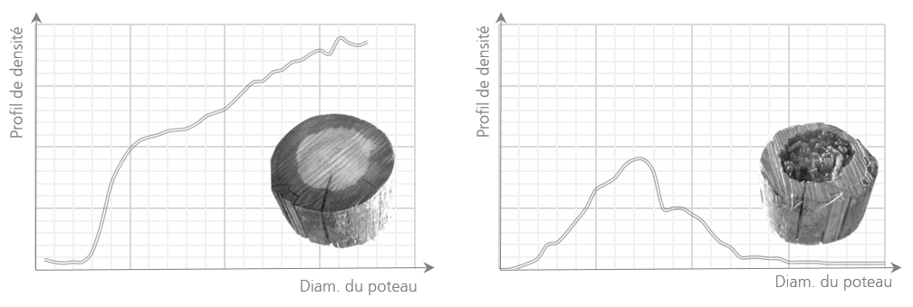 POLUX 5 enregistre le profil de densité du bois ainsi que l'humidité interne du poteau pour évaluer tout risque de dégradation active.